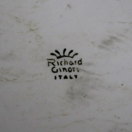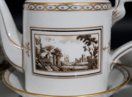 Servizio tête-à-tête da caffè Richard Ginori, in porcellana con decori geometrici, vegetali e riquadri raffiguranti paesaggi, nei toni dell'oro, del bianco, del blu e del seppia, misure massime cm 22,5x32,5, (difetti e sbeccature)