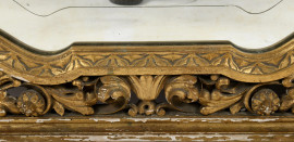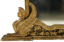 Specchiera in legno dorato e intagliato con porzioni laterali inferiori a foggia di sfingi alate, inizio XX secolo, 131x121, (difetti)
