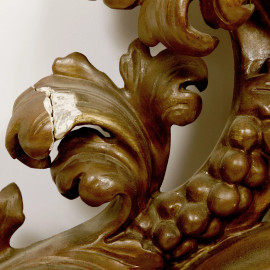 Specchio con cornice in legno intagliato e con decori traforati a volute vegetali, cm 73,5x63