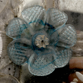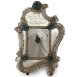 Specchio in vetro di Murano con decori incisi a motivi vegetali e applicazioni a foggia di foglie e fiori blu, XX secolo, cm 60x40 (difetti)