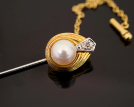 Spilla in oro con perla e brillantini, cm 7, peso gr 6