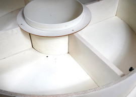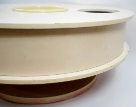 Tavolinetto circolare in legno laccato bianco, con biano rotabile e vani interni, XX secolo, altezza cm 40, diametro cm 95,5, (difetti)