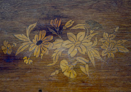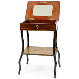 Tavolinetto da lavoro in legno intarsiato in varie essenze, con doppio ripiano, piano superiore apribile contenete specchio e triplo scomparto, gambe mosse laccate di nero, XX secolo, cm 73x50,5x35,5, (difetti)