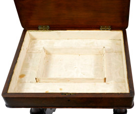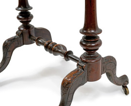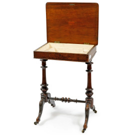Tavolino da lavoro in noce poggiante su due gambe tornite con decori intagliati raccordati da una traversa, XIX secolo, cm 40x49x71