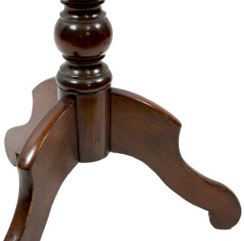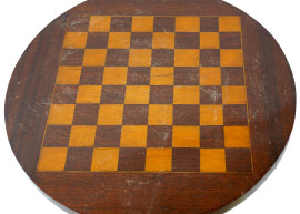 Tavolino in legno con piano circolare intarsiato a scacchiera, poggiante su una gamba tornita terminante a tre piedi, XX secolo, diametro cm 46, altezza cm 81 (difetti)
