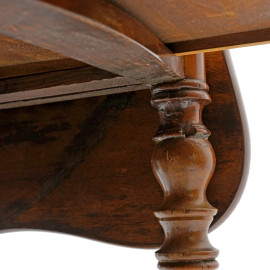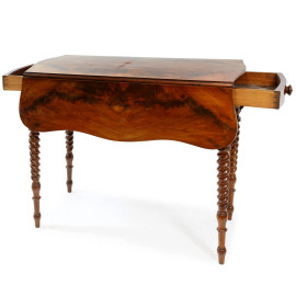 Tavolo a bandelle in piuma di mogano, con cassetti su lati brevi e gambe tortili, XIX secolo, cm 75x91x42 (aperto cm 74x91x94), (difetti)