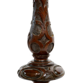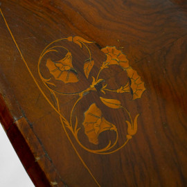 Tavolo ovale in noce con decori floreali intarsiati, poggiante su due gambe tornite e intagliate raccordate da una traversa centrale, XIX secolo, cm 71,5x105x58 (difetti)