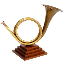 Tromba su base lignea, XX secolo, cm 27x32x14,5, (difetti)