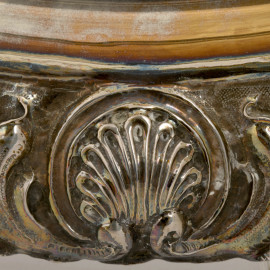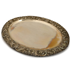 Vassoio ovale in argento con profilo cesellato a motivi vegetali, a ricciolo e conchiglie, XX secolo, peso gr. 900 , cm 35x45,5