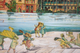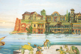 Veduta marina con festa di putti, tecnica mista su carta, XX secolo, cm 20,8x28, entro cornice