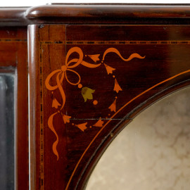 Vetrinetta in mogano con decori intarsiati in varie essenze, poggiante su quattro gambe mosse, primo XX secolo, cm 150x109x32,5 (difetti)