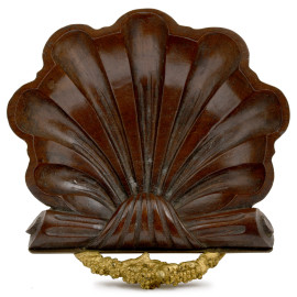 Alzata ornamentale in legno a guisa di conchiglia di ispirazione classica, montata su fusto tornito in ottone su base in marmo giallo. Fine del XIX- inizi del XX secolo, cm 12x13x15,