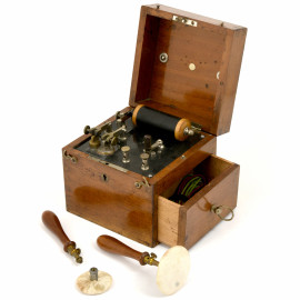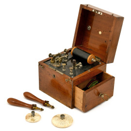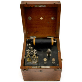 Apparecchio telegrafico a cassetta in legno e ottone, XIX secolo, cm 12x13x13, (difetti)