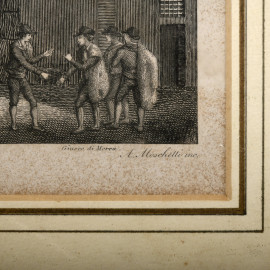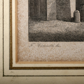 Avanzi del foro di Nerva, incisione su carta, iscritto in basso "F. Cicconetti dis" e " A. Moschetti inc.", cm 26x33,5 compreso passepartout, (difetti e tracce di umidità)