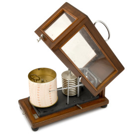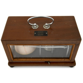 Barografo in custodia di legno con vetro dotato di manico in metallo, XX secolo, cm 17,5x27,5x15,(difetti e meccanismo da revisionare)