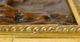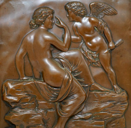 Bassorilievo in bronzo patinato raffigurante Venere e Cupido, inizi del XX secolo, cm 24x19 entro cornice, (difetti)