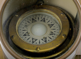 Bussola inserita in struttura con lanterna per illuminazione notturna. Il quadrante della bussola presenta una rosa dei venti incisa e protetta da un vetro circolare. La lanterna laterale presenta sportello apribile con lampadina e allaccio elettrico. Base circolare forata per il fissaggio su superficie di legno o metallo, tipica delle attrezzature da bordo.