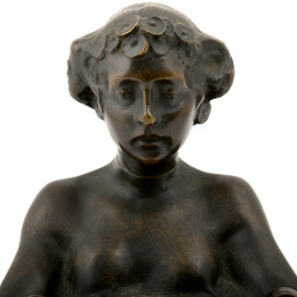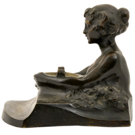 Calamaio in bronzo patinato a guisa di giovane donna che offre una canestra, primi decenni del XX secolo, cm 13x14,3x14, (difetti). Riparazione al collo.