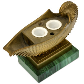 Calamaio in ottone a foggia di conchiglia, con base in malachite. XX secolo, cm 16x19x8, (difetti)
