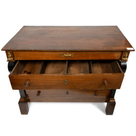 Cassettone in noce stile Impero con piano rettangolare e montanti mossi in legno ebanizzato, XIX secolo, cm 95x118x56,5 (difetti)