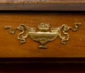 Fronte a quattro cassetti, uno a scomparsa con organizzazione interna a quattro vani e tre ampi cassetti con maniglie a pomello tornito e serrature con boccachiave riccamente lavorato. I montanti laterali, leggermente incurvati in legno ebanizzato, sono arricchiti da applicazioni in bronzo dorato a motivo floreale nella parte superiore.
