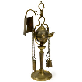 Centilena in metallo, XIX secolo. Base a colonna con piedistallo circolare. Braccio superiore arcuato con elemento decorativo. Serbatoio sferico con coperchio (difetti)
