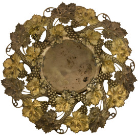 Centrotavola in argento 800/000 con delicato sbalzo a tralci d'uva alla tesa. XX secolo, diametro cm 19; peso gr 324, (difetti e segni di ossidazione)