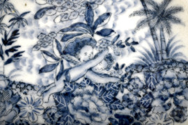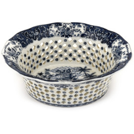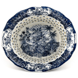 Centrotavola portafrutta in ceramica con particolare lavorazione traforata. Decori floreali a smalto blu su fondo a smalto bianco. Nel cavo raffigurata scena di putti in un bosco di ispirazione orientale. XX secolo, cm 12x31,5x28, (difetti)
