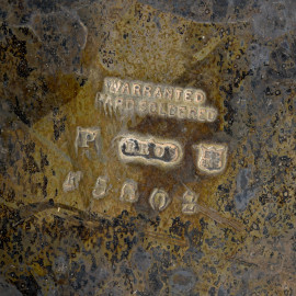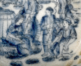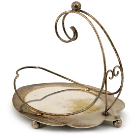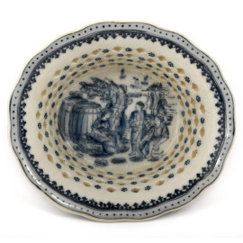 Cestino in ceramica traforata con decoro blu su fondo bianco, poggiato su una struttura in Electro Plated Nichel Silver con manico arcuato. Il motivo decorativo al piatto presenta una scena di genere con personaggi. XX secolo, (difetti). Cm 22x22x24