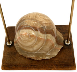 Conchiglia scolpita in pietra saponaria e fissata su base in legno con struttura in ottone. XX secolo. Dimensioni complessive cm 50x20x1