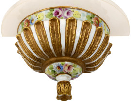 Coppia di acquasantiere adattate a mensola in porcellana dipinta e dorata. Inizi del XX secolo, cm 20x9x16 (difetti)