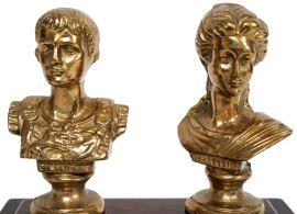 Coppia di busti di imperatore e imperatrice in ottone dorato. Base rettangolare in legno con cassetto al fronte. XX secolo, cm 14x5x6, (difetti)