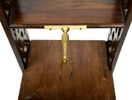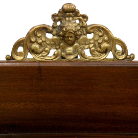 Struttura leggera e decorazioni intagliate sulle spalle laterali. Il mobile è organizzato a quattro ripiani, con una fascia superiore a parapetto sagomato con cimasa in bronzo dorato. La parte inferiore presenta quattro cassetti.