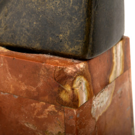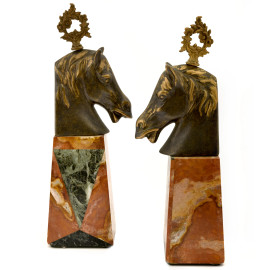 Coppia di fermacarte a guisa di teste di cavallo in bronzo patinato con finiture dorate, poggianti su una base piramidale in marmo rosso e inserti geometrici in marmo verde su uno dei lati. XX secolo, cm 37,5x8x10, (difetti)