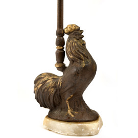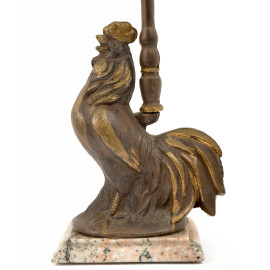 Coppia di fermaporta in metallo patinato e dorato con base in marmo e scultura di un gallo. Tracce di doratura alle zampe e alla cresta. XX secolo, altezza cm 55,5, (difetti)
