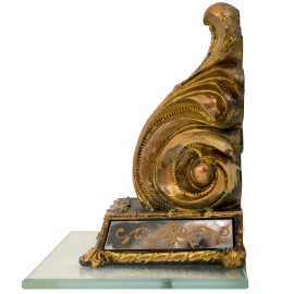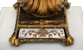 Coppia di mensole in resina dorata e inserti in specchio decorato in oro. Base in vetro trasparente, XX secolo, cm 16x15x12, (difetti)
