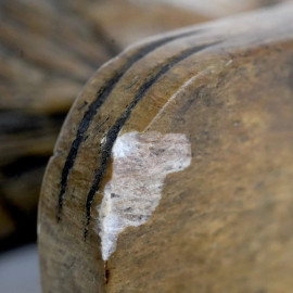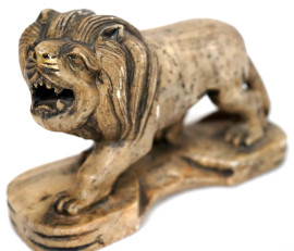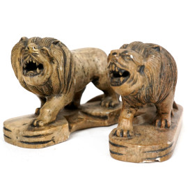 Coppia di piccole sculture raffiguranti leoni in pietra, XX secolo, cm 7x11x4, (difetti)