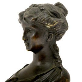 Coppia di piccoli busti in bronzo raffiguranti figure femminile di ispirazione neoclassica. Alla base perni per applicazione su supporti in marmo o pietra. XIX secolo. Cm 12x7,5x5, (difetti)