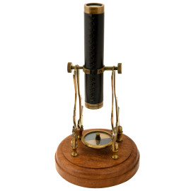 Il telescopio è montato su supporto decorativo in ottone con elementi stilizzati a forma di foglie e motivi ornamentali. La base è in legno tornito e presenta piccolo carillon con parte superiore in vetro colorato a sezioni.