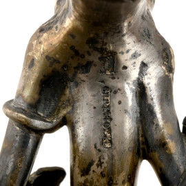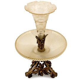 Elegante centrotavola Christofle con struttura a treppiede decorata con motivi naturalistici, a supporto di una coppa in vetro satinato e di un vaso superiore in cristallo inciso con motivi floreali e fitomorfi, XX secolo, (difetti e scheggiature)