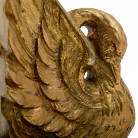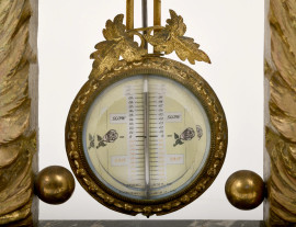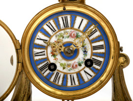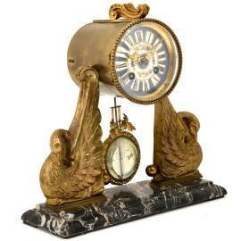 Il quadrante circolare smltato presenta numeri romani e una decorazione floreale policroma su sfondo bianco e azzurro. Il meccanismo è protetto da una cassa con sportello in vetro apribile. La struttura è sorretta da due montanti laterali finemente scolpiti a forma di cigno, motivo ornamentale tipico dell'epoca, poggiante su una base. Nella parte inferiore è presente un cronometro, incorniciato da una ghiera in bronzo dorato e arricchito da elemento fogliaceo in bronzo dorato. Il cronometro riporta la scala per la regolazione del ritmo dell'orologio con indicazioni in inglese e la dicitura "Patented, March 25 th 1881".