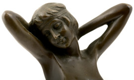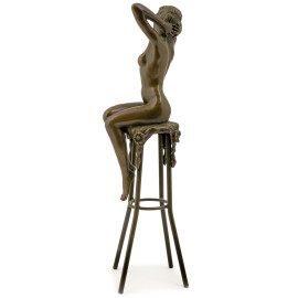 Elegante scultura in bronzo raffigurante nudo di giovane donna seduta su alto sgabello, inizi del XX secolo, altezza cm 27