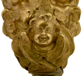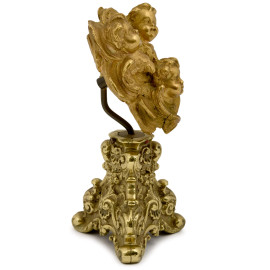 Elemento decorativo con tre cherubini scolpiti a rilievo in bronzo dorato. La base in metallo dorato a guisa di capitello, presenta elementi floreali e volute. XX secolo, cm 18x9x9, (difetti)