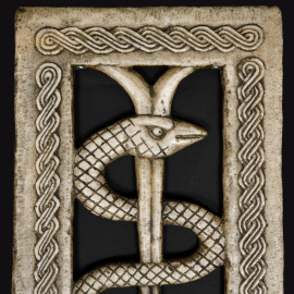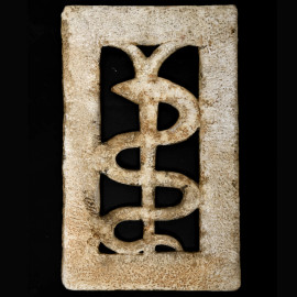 Elemento decorativo rettangolare in marmo con motivo a rilievo raffigurante serpente attorno ad un bastone biforcato, fine del XIX secolo ed inizi del XX secolo (difetti), cm 59,5x35,5
