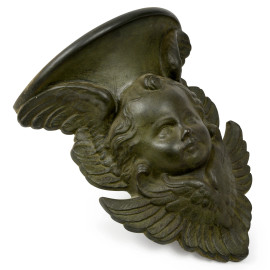 Elemento ornamentale in ghisa tinta bronzo imitante acquasantiera con cherubino, XX secolo, cm 31x25x10, (difetti)