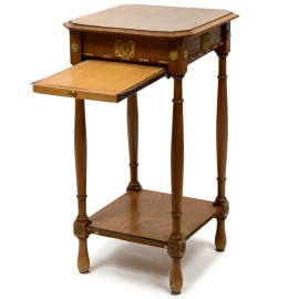 Etagère in legno di rovere, caratterizzato da un piano superiore sagomato e un piano inferiore d'appoggio e raccordo tra le gambe tornite. XX secolo, cm 72x40x38 (difetti).
