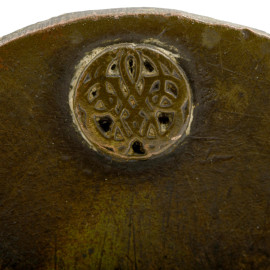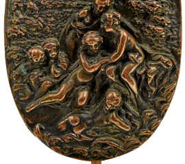 Fermacarte con rilievo raffigurante una scena pastorale con figure mitologiche o allegoriche in contesto bucolico, base a capitello corinzio riccamente cesellato, XX secolo, cm 16x8, (difetti)