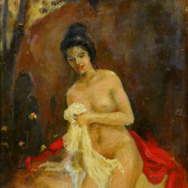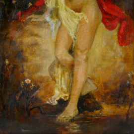 Giovane donna al fiume, olio su tavola, XX secolo, cm 36x20 entro cornice