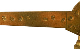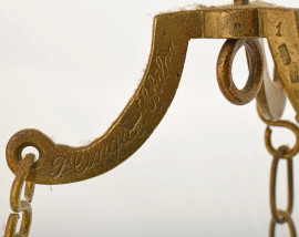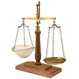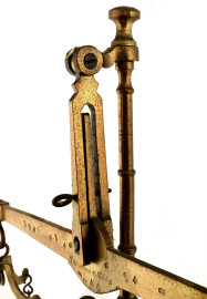 Grande bilancia a due piatti, uno in ottone e l'altro in vetro dal profilo mosso. Struttura composta da fusto tornito in legno e ferramenta in ottone. Base in marmo. XX secolo, cm 83x50x25 (difetti)