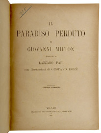 Il paradiso perduto di Giovanni Milton, tradotto dal Lazzaro Papi, con illustrazioni di Gustavo Doré.Milano, Casa Editrice Sonzogno, 1881. In folio, legatura in piena tela, titolo in oro su tassello in pelle al dorso